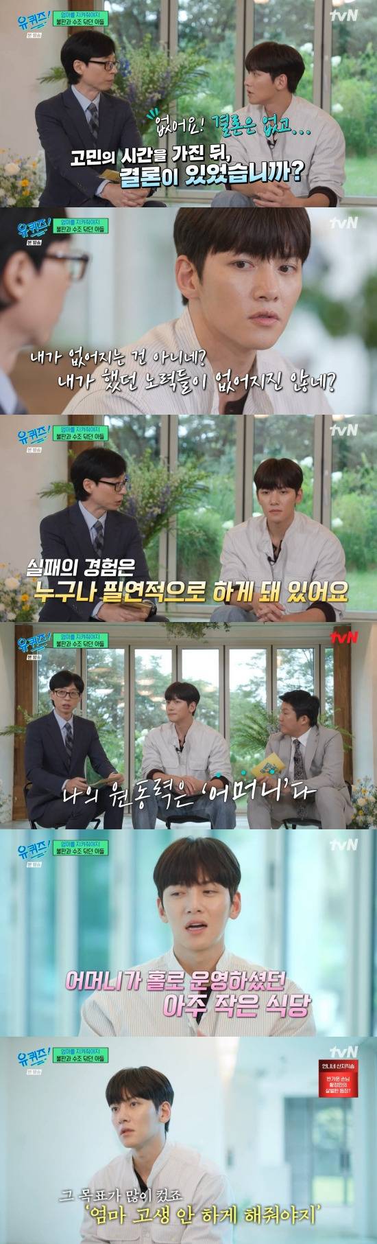 지창욱은 "그 당시에는 되게 허름한 골목길에서 밤에 엄마랑 둘이 손잡고 가는데 제가 엄마보다 작았을 때 근데 내가 빨리 엄마보다 커지면 지켜줘야겠다. 이런 생각을 좀 많이 했던 거 같다. 어렸을 때 어머니가 저희 동네에서 고깃집도 하셨고 매운탕집도 하셨다. 어머니가 혼자 가게를 동네에서 진짜 조그마한 식당이었다. 혼자 운영을 하시니까 너무 바쁠 땐 제가 가서 서빙하고 고깃집을 할 때는 불판 닦는 게 제일 힘들었고 매운탕집을 했을 때는 제 기억에 수조 청소하는 게 제일 힘들었던 거 같다"라며 과거를 회상했다.