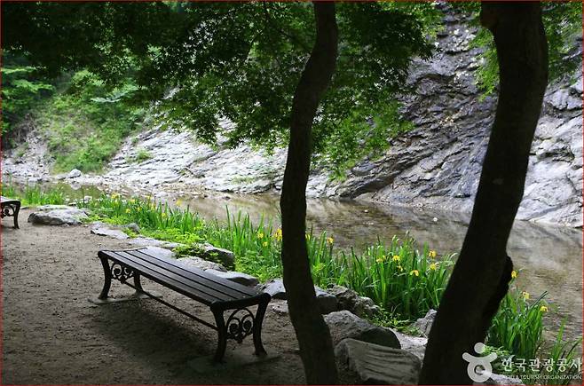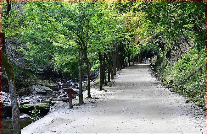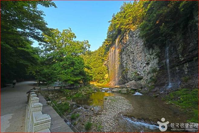 병풍폭포는 관리사무소에서 불과 100m 상류에 자리해 접근성이 좋아, 가족 단위 여행객들도 쉽게 즐길 수 있습니다. 또한 이 지점부터는 맨발 산책로가 시작되어 자연 속에서 건강한 힐링을 경험할 수 있습니다.
