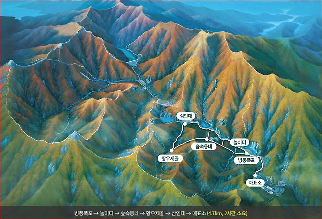 병풍폭포 - 놀이터 - 숲속동네 - 황우제골 - 삼인대 - 매표소 (4.7km, 2시간 소요)