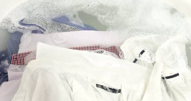 불리는 동안 섬유가 이완되면서 내부의 찌든 때가 자연스럽게 빠져나온다. 무리하게 문지르면 옷감이 손상될 수 있다.