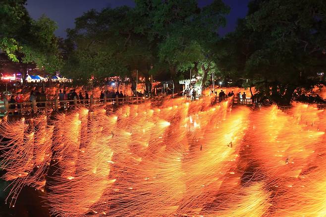 함안 낙화놀이는 경남 함안에서 전해 내려오는 전통 민속놀이로, 나무숯(낙화통)과 불씨로 불꽃을 내려뜨려 밤하늘에 낙화(落花)처럼 빛나는 불꽃을 연출하는 행사에요.