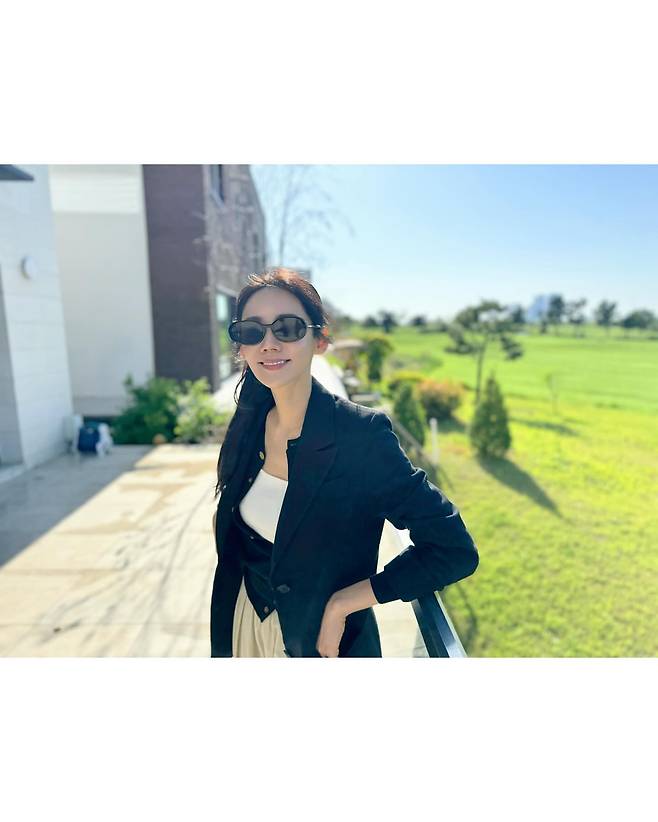 추자현이 블랙 재킷과 화이트 이너웨어를 조합한 모던 시크 룩을 완성하고 있다. 작은 사이즈의 블랙 선글라스는 세련된 분위기를 더하며, 자연광 아래에서 더욱 빛나는 스타일을 연출하고 있다. 미니멀한 디자인의 재킷과 화이트 톤의 이너웨어는 클래식함과 현대적 감각을 동시에 보여주며, 푸른 잔디밭을 배경으로 한 콘트라스트가 시선을 사로잡는다. 단정하게 묶은 헤어스타일은 전체적인 룩에 세련미를 더한다.