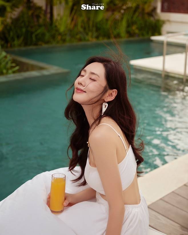 수영장을 배경으로 추자현이 청량감 넘치는 화이트 원피스를 선보이고 있다. 스파게티 스트랩의 크롭 탑과 하이웨이스트 스커트의 세트 스타일링은 여름 리조트에 어울리는 세련된 휴양지 패션을 완성한다. 오렌지 주스가 담긴 유리잔을 들고 있는 모습은 여유로운 휴식의 순간을 포착했으며, 자연스럽게 흩날리는 웨이브 헤어와 화이트 컬러의 의상은 청량하고 순수한 분위기를 연출하고 있다. 특히 화이트 컬러와 에메랄드빛 수영장의 대비가 시원하고 세련된 여름 감성을 극대화한다.