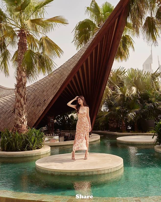 열대 리조트를 배경으로 추자현이 우아한 플로럴 패턴의 홀터넥 드레스를 입고 있다. 연한 핑크 색상의 꽃무늬 드레스는 슬릿 디테일로 여성스러움을 강조하며, 야자수와 수영장이 있는 이국적인 배경과 완벽한 조화를 이루고 있다. 미니멀한 액세서리와 심플한 샌들로 마무리한 룩은 휴양지의 여유로움과 고급스러움을 동시에 표현하고 있다. 특히 독특한 건축 구조물을 배경으로 한 포즈는 마치 화보 속 한 장면을 연상케 한다.