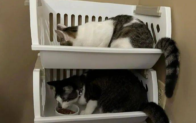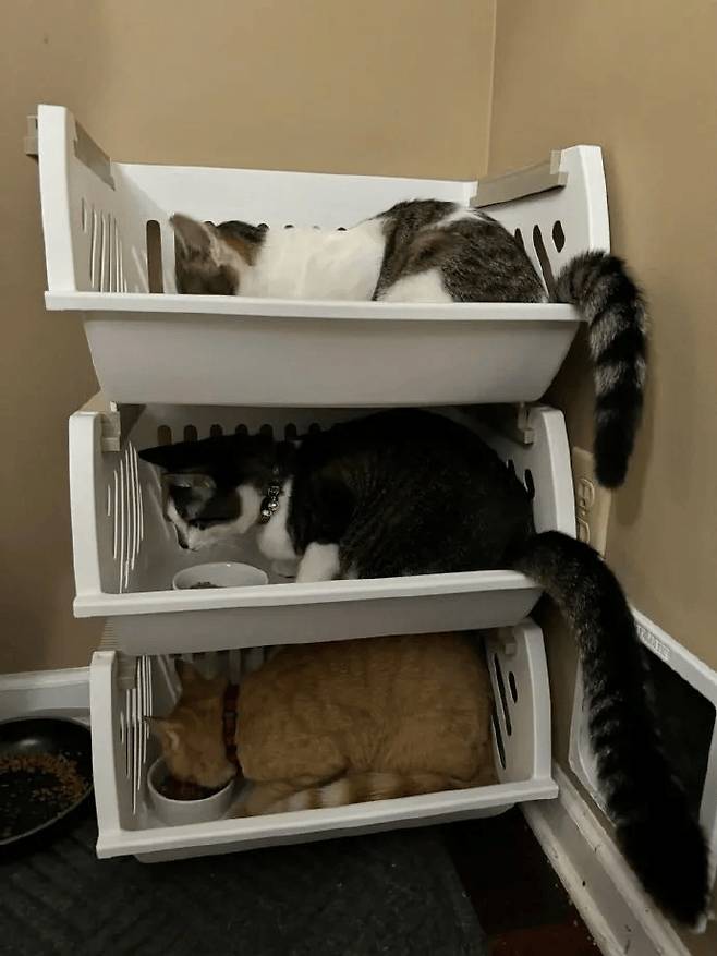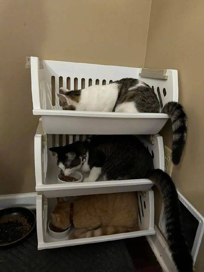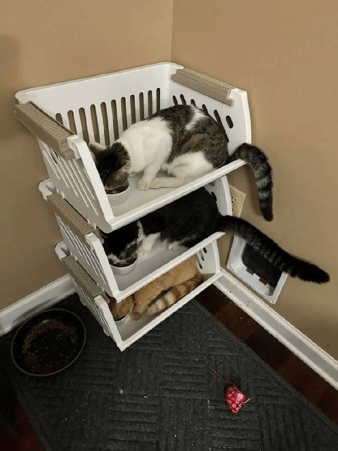 집사는 이 문제를 해결하기 위해 창의적인 방법을 고안했습니다. 바로 '1묘 1층' 급식 시스템을 도입한 것입니다. 각 고양이에게 독립된 층을 배정해 다른 고양이의 방해 없이 편안하게 식사할 수 있는 환경을 마련했습니다.