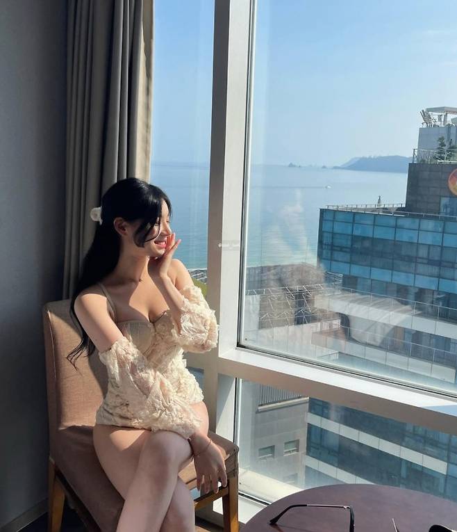 두 번째는 실내에서 푸른 바다를 배경으로 착용한 우아한 모노키니 스타일입니다. 크림 컬러 바탕에 레이스 디테일이 가득한 이 의상은 마치 고급스러운 리조트 드레스를 연상시킵니다.