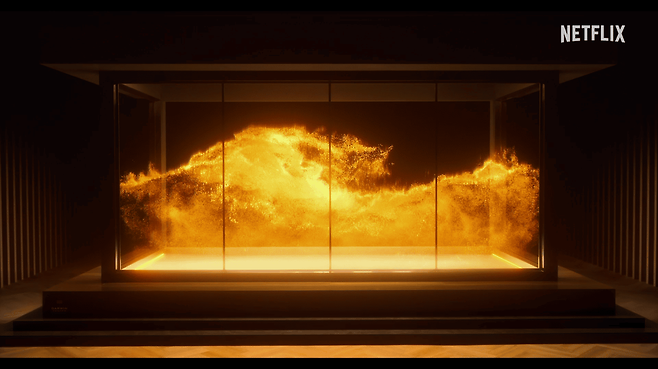 안나는 “그냥 내가 찾게 좀 해줘요”라며 울먹이는 모습으로 아파트 곳곳을 헤집으며 자인이를 찾아 나서지만, 안나를 구조해야 하는 사명을 가진 희조는 안나를 가로막으며 이들의 팽팽한 대립이 이어진다. 파도와 동일한 파형을 띄고 있는 정체불명의 황금색 입자는 <대홍수>가 어떤 놀라운 이야기를 펼쳐낼지 기대를 더한다.