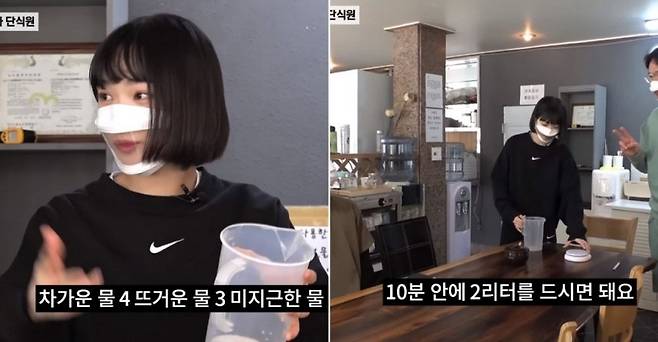 그 다음에 다른 음식은 먹지 않고 요가같은 운동으로 몸을 스트레칭해주셔야 합니다. 이러다 1시간 안에 설사를 하게 되면 생수 1컵을 마셔주시면 되는데요.