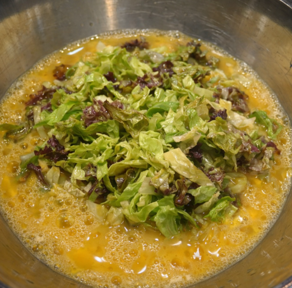 준비한 상추를 풀어둔 계란물에 넣어 가볍게 섞는다. 이때 너무 오래 저으면 상추가 숨이 죽어 식감이 줄어들 수 있다. 상추의 식감을 살리기 위해 가볍게 섞어주는 정도가 좋다. 이렇게 하면 계란 속에 상추가 골고루 퍼져 계란말이를 만들 때 균형 있게 들어간다.