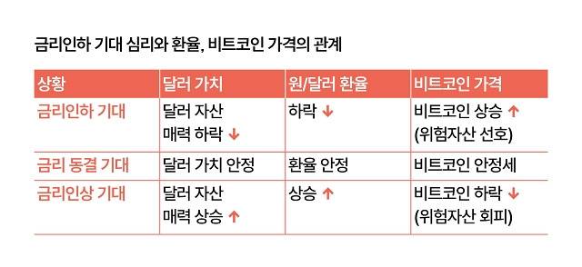 반면 주가와 비트코인 가격은 금리와 반대로 움직이는 경향이 있습니다. 금리를 내리면 사람들이 돈을 은행에 묶어두기보다는 주식이나 비트코인 쪽에 더 투자하게 되니까요. 주가가 오르고 비트코인 가격도 상승할 수 있죠. 최근 금리인하 기대감이 커졌다는 소식이 나올 때마다 미국 주가가 오르고 비트코인 가격도 큰 폭으로 뛰어올랐던 이유입니다.