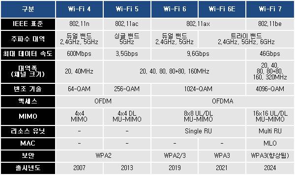 지난 해 발표된 최신 IEEE 802.11be 'Wi-Fi 7'은 기존 Wi-Fi 6보다 더 빠른 무선 링크 속도를 지원하며, 320MHz 초광대역폭, 4K(4096) QAM 변조 기술, 멀티 리소스 유닛(RU) 지원, 그리고 멀티 링크 동작(Multi-Link Operation, MLO) 기술 등이 적용된다. 네트워크 간섭으로 Wi-Fi가 느려지지 않도록 하는 Preamble Puncturing도 사용한다.
