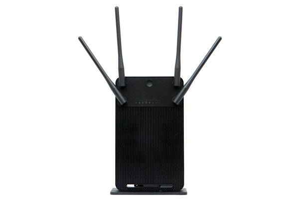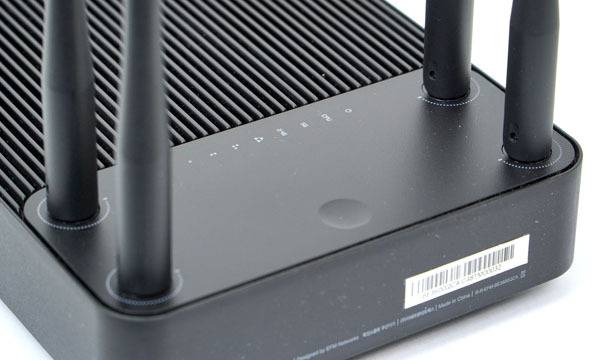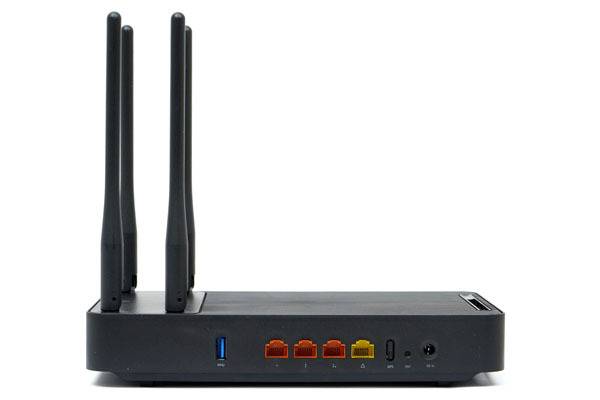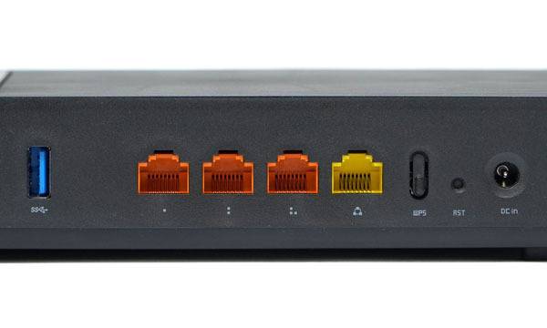 본체 후면에 보이는 연결 포트는 좌측부터 USB 3.0 포트, 3개의 주황색 LAN 포트, 노란색으로 표시된 WAN 포트, WPS 푸쉬 버튼, 리셋(RST) 홀, 그리고 DC IN 외부 전원 어댑터 연결 단자로 구성된다.