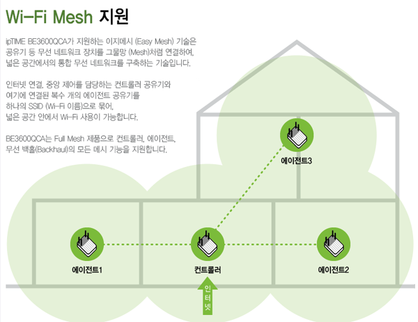 ipTIME 네트워크 기기들이 지원하는 이지 메시(Easy Mesh) 기술을 통해 인터넷 연결 및 중앙 제어를 담당하는 컨트롤러 공유기와 여러 개의 에이전트 공유기를 하나의 SSID로 묶어 넓은 공간에서 음영 지역 없는 Wi-Fi 사용이 가능하다.