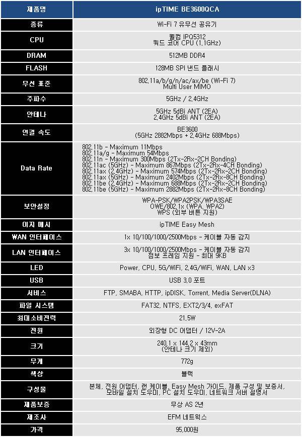 제목 : 경제적인 듀얼밴드 Wi-Fi 7 공유기, ipTIME BE3600QCA