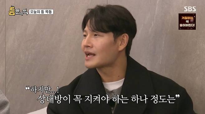 유연석은 "결혼 상대 중 절대 안 되는 한 가지만 꼽아달라"고 김종국에게 물었다. 김종국은 "에이, 절대 안 돼 같은 게 어딨냐"면서도 "그런 건 있다. 상대가 행복해하는 걸 옆에서 존중해줬으면 좋겠다"는 바람을 비췄다. 이에 차태현은 "자기 운동하는 거 신경 쓰지 말라는 것"이라고 정곡을 짚어 웃음을 자아냈다.