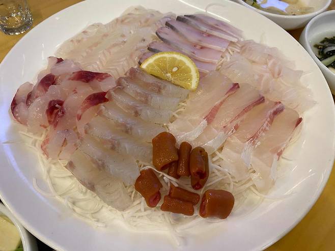 잡어회 중자: 10만원. 광어. 참돔. 숭어. 병어 등으로 구성된 숙성회 한접시. 특별히 현지화된 잡어가 없는 게 아쉽지만 숙성회 맛이 기가 막힙니다. 숭어가 이렇게 맛있나요? 낚시로 잡으면 버리는데… 좋은 재료에 깔끔하고 숙련된 솜씨가 느껴집니다. 예약하려면 잡어회 무조건 먹어야 한다네요.