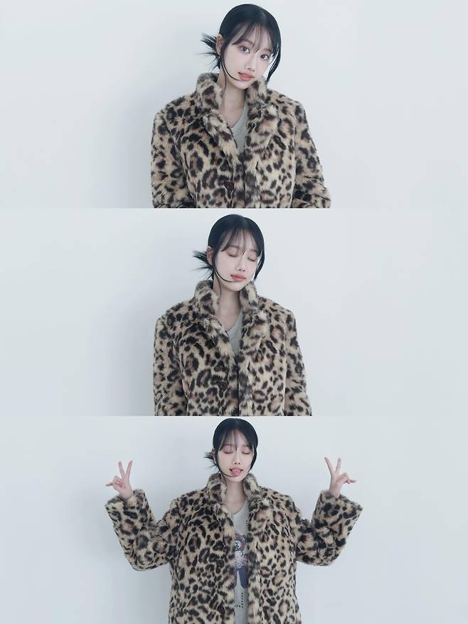 사진 속 이나은은 평소 보여주었던 청순하고 맑은 이미지와는 180도 다른, 거칠고 와일드한 패턴의 퍼 코트를 입고 카메라를 응시하고 있는데요.