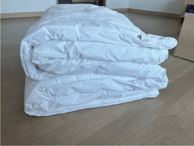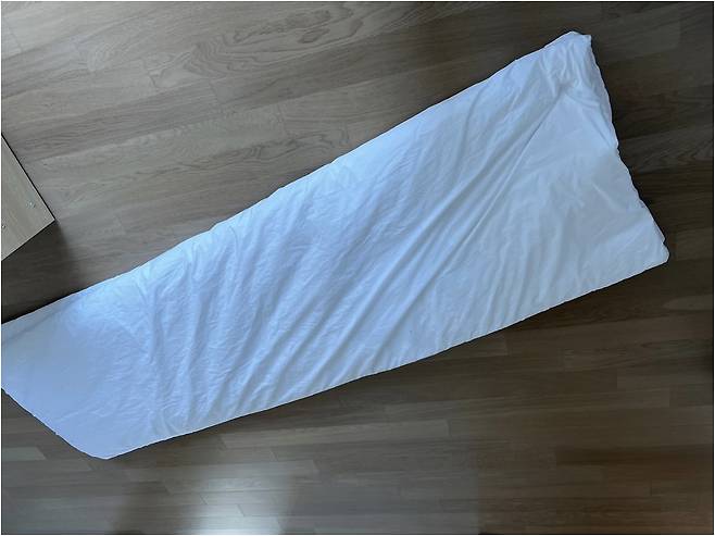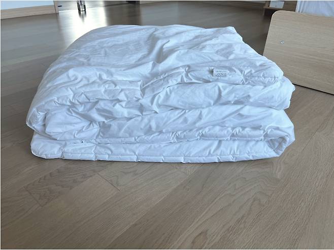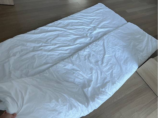 먼저 이불을 쫙~ 펼쳐준 후 가로로 1/3 접어주세요