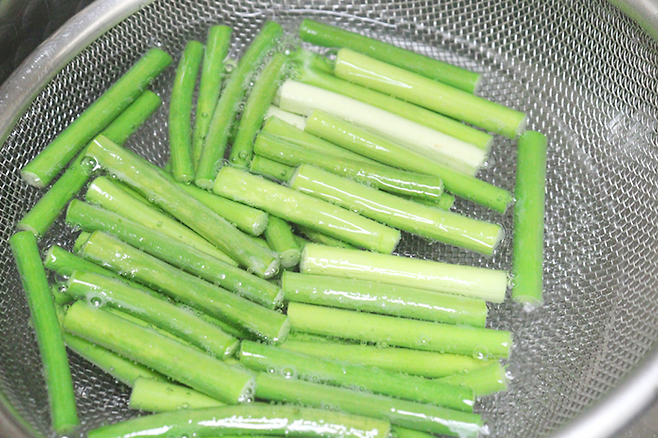 데친 마늘쫑을 바로 찬물에 담가 열기를 식힌 뒤 체에 밭쳐 물기를 뺍니다.