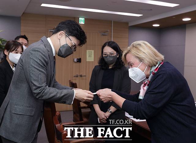 [더팩트|이선화 기자] 한동훈 법무부 장관이 9일 오후 경기도 과천시 정부과천청사 집무실을 예방한 아나 쥬뱅-브레 유엔국제상거래법위원회(UNCITRAL) 사무국장과 악수를 나누고 있다.