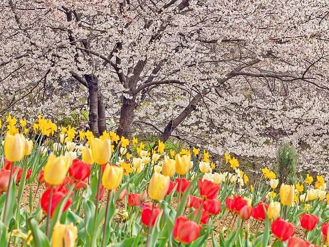 벚꽃만 있는 것이 아니다. 연희숲속쉼터는 산책로 한편을 수놓은 튤립이 벚꽃과 조화를 이루며 더욱 다채로운 봄 풍경을 자아낸다.