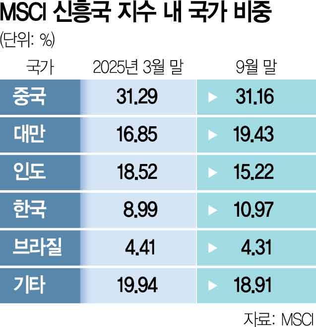 14일 모건스탠리 자회사인 MSCI에 따르면 9월 말 기준 신흥국 지수 내 한국 시가총액이 차지하는 비중은 10.97%를 기록했다. 지난해 12월 비상계엄 사태로 10% 미만으로 축소된 데 이어 올해 3월 8.99%로 1998년 외환위기 이후 최저 수준까지 하락했다가 증시 회복과 함께 지수 내 비중도 늘어난 것이다. 올 3월 이후 한국(1.98포인트)과 대만(2.58%포인트) 비중이 크게 늘어난 반면 중국(-0.13%포인트)과 인도(-3.30%포인트) 비중이 축소된 것으로 나타났다.