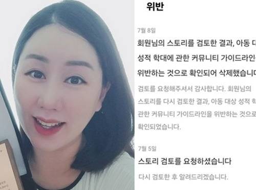 황신영이 공개한 SNS 계정 신고 당한 내용을 보면 ‘아동 대상 성적 학대에 관한 커뮤니티 가이드라인을 위반하는 것으로 확인되어 삭제했습니다’라고 안내되고 있다. 더불어 42일 동안 라이브 방송을 할 수 없게 된 상황이다. 이에 황신영은 “나 그런 적 없다”며 억울함을 표했다.