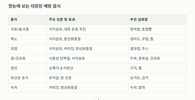 이렇게 대장암 예방에 좋은 음식으로 식단을 구성하면,장 건강을 지키고 대장암 위험을 낮출 수 있습니다!
