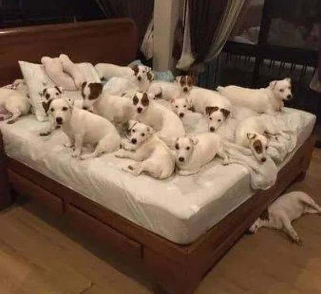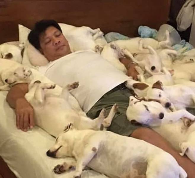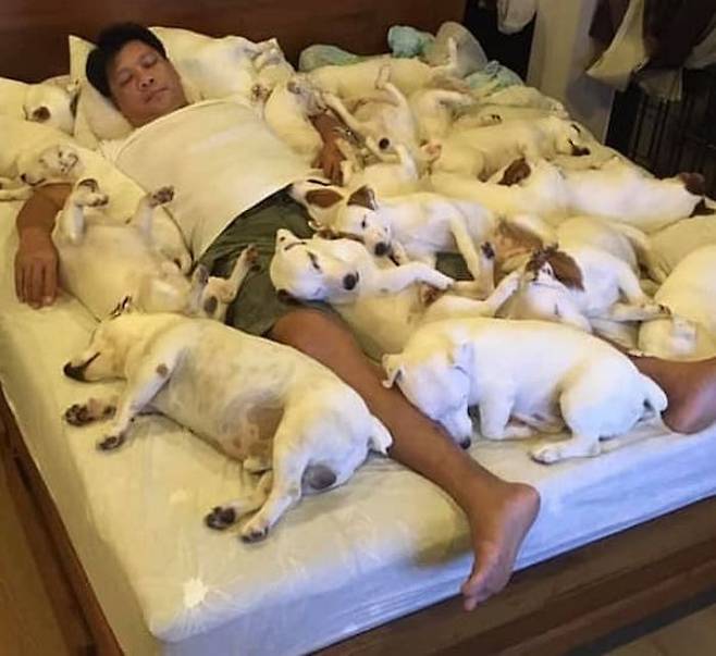 강아지들은 침대 위에 누워 있을 틈조차 없이 촘촘하게 누워있었습니다. 강아지들 사이에서 행복한 표정을 지어 보이며 자고 있는 남자.