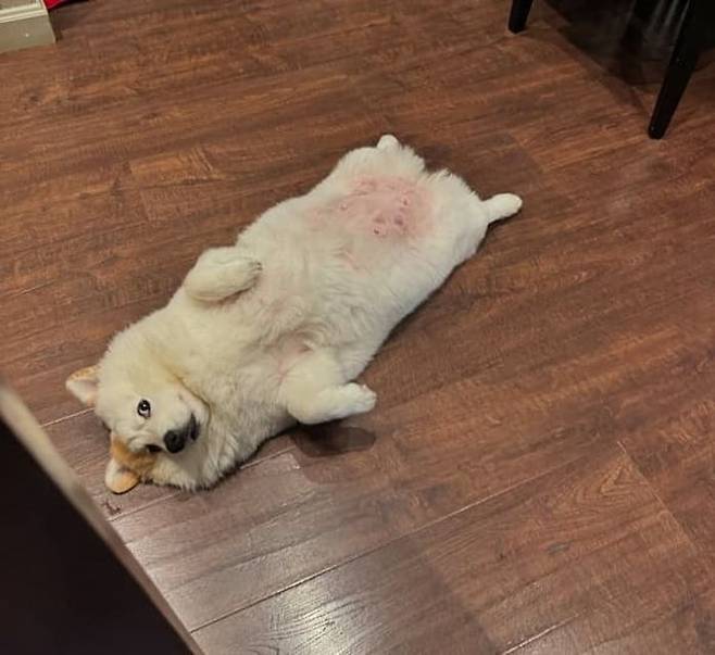 공개된 사진 속에는 짧은 다리에 통통하지만 신기할 정도로 몸이 길쭉하게 늘어져 있는 웰시코기 강아지 모습이 담겨 있는데요.
