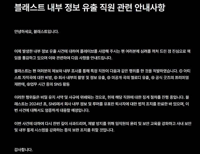 블래스트는 팬 여러분의 제보와 내부 조사를 통해 특정 직원이 다음과 같은 행위를 한 것을 적발하였습니다. ① 아티스트 자작곡에 대한 비방, ② 회사 내부의 촬영 및 정보 유출, ③ 미공개 곡의 멜로디 유출, ④ 공식 굿즈의 프리미엄 재판매, ⑤업무 시간 중의 SNS 활동
