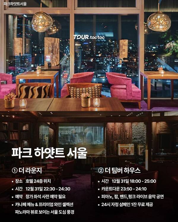 라이브 음악과 함께 분위기 있는 연말을 보내기에 제격이죠. 지하에 위치한 더 팀버 하우스에서는 피아노부터 팝, 펑크까지 다양한 장르의 라이브 공연과 함께 자정 샴페인을 제공하는 이벤트가 진행됩니다.