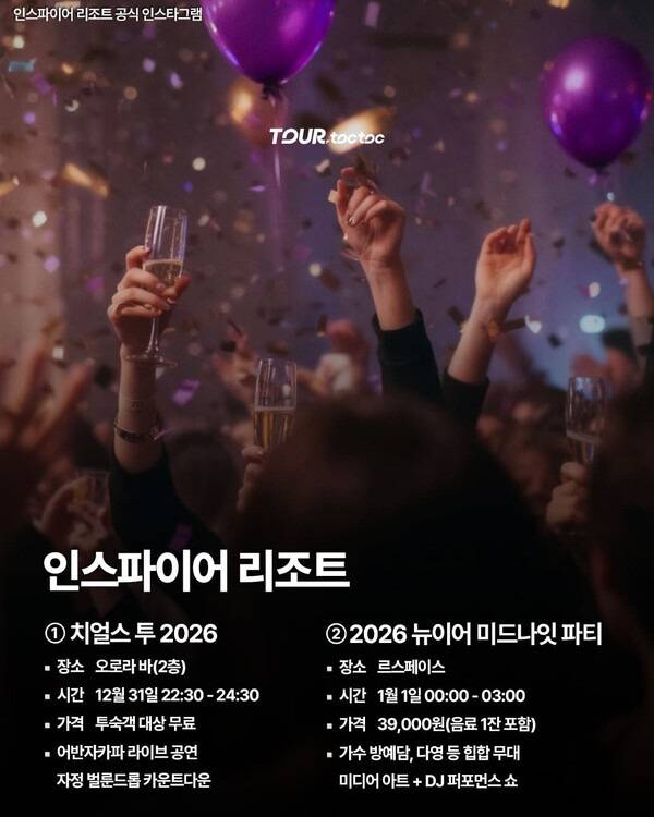 오로라 바에서는 어반자카파의 감미로운 라이브와 함께 벌룬드롭 카운트다운을, 자정 이후 르스페이스에서는 방예담, 다영 등의 힙합 무대와 DJ 퍼포먼스가 이어지며, 2026년의 시작을 화려하게 장식합니다.