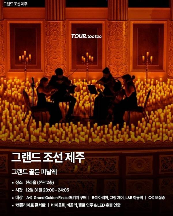 한라홀에서 열리는 '그랜드 골든 피날레'는 바이올린, 비올라, 첼로로 구성된 클래식 공연과 함께 LED 촛불로 연출된 낭만적인 분위기를 선사합니다.