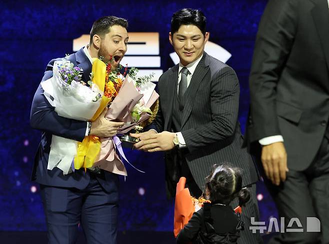 [서울=뉴시스] 이영환 기자 = LG 트윈스 오스틴이 13일 오후 서울 강남구 코엑스 오디토리움에서 열린 2024 KBO 골든글러브 시상식에서 1루수 부문 골든글러브를 수상하자 동료 오지환, 박동원의 딸에게 꽃다발을 받고 있다. 2024.12.13. 20hwan@newsis.com