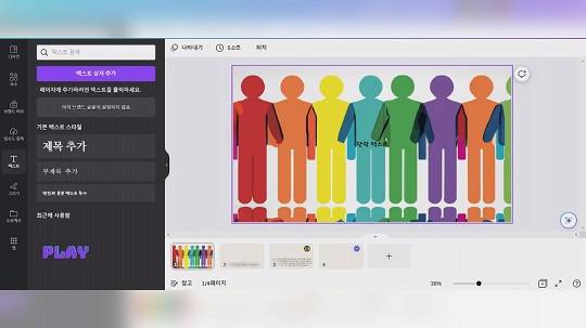 그림 검색을 맡은 학생이 제목에 맞게 무지개색의 사람들이 손을 잡고 있는 그림을 찾으면 글과 그림을 어울리게 편집합니다.