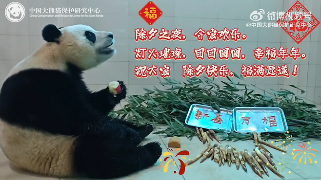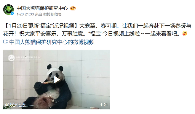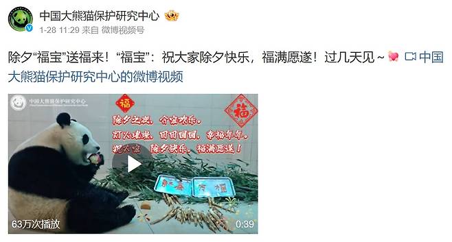 한국과 중국 모두 설 연휴였던 지난 28일 중국판다보호연구센터(이하 판다센터)는 SNS에 '새해 전날에 축복을 가져다주는 푸바오' 영상을 공개했습니다.