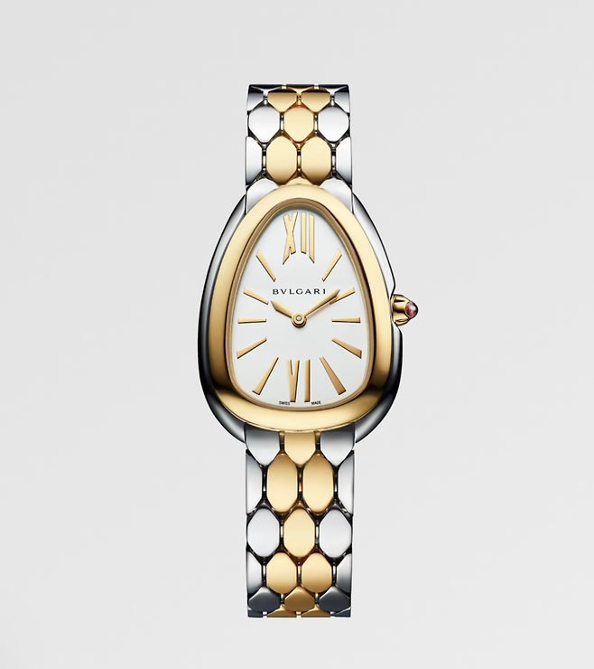 스테인리스 스틸과 18K 옐로우 골드의 조합으로 제작된 이 워치는, 뱀의 머리를 연상시키는 유니크한 물방울 형태 케이스가 특징이다.