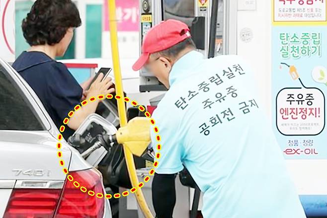 다음은 공회전 문제다. 엔진을 정지하지 않고 주유를 하다 보면 배출가스가 지속적으로 발생하게 된다. 이는 당연히 환경적으로 좋지 못한 결과를 낳는다. 환경 문제따윈 신경 쓰지 않을 지 언정 본인의 경제적 문제를 신경쓰지 않는 운전자는 없을 것이다. 계속된 공회전은 연료 소비를 늘리기 마련이다. 단순하게는 필요 이상의 유류비가 들어가게 되는 것이며, 이를 누군가 신고라도 하는 경우 앞서 언급한 위험물안전관리법에 의거 과태료 처분까지 받을 수 있다는 점을 명시해야 한다.