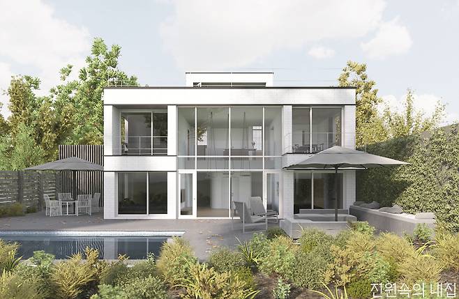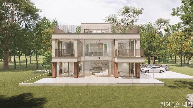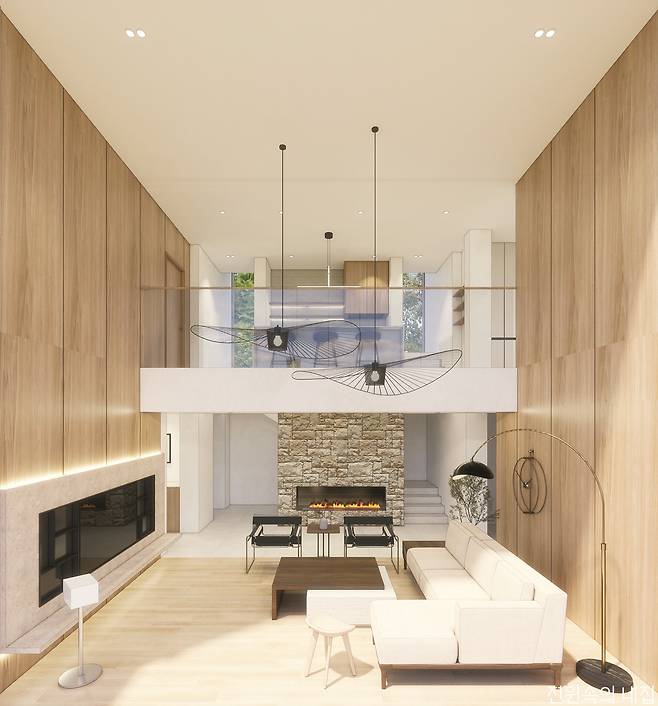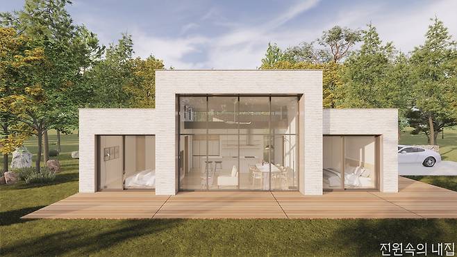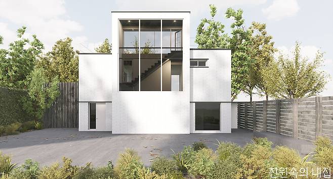 2층은 부담스럽다. 그런데, 눈앞의 자연과 채광은 풍부하게 들이고 싶다. 그런 건축주에게 추천하는 27평형 모델. 높은 층고로 만들어진 거실창으로 햇살이 집 안을 밝게 비춘다.