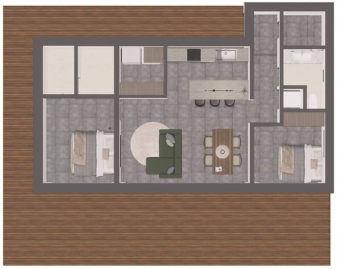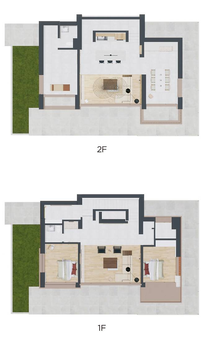 단층에 넉넉함을 더한 22평형 모델. 각각 두 개의 침실과 욕실을 갖춰 손님이 와도 충분하다. 7평형 모델이 조금 아쉬운 건축주라면, 단층이라는 편리함에 조금의 여유를 더해 보자.