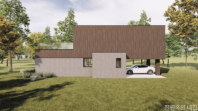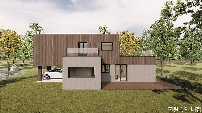 ‘모듈러건축은 모양이 늘 비슷하다’고 생각한 건축주에게 제안하는 독특한 매스의 30평형 모델. 필로티는 비 오는 날에도 출입이 편리하고, 두 개의 테라스로 외부공간과의 조화도 훌륭하다.