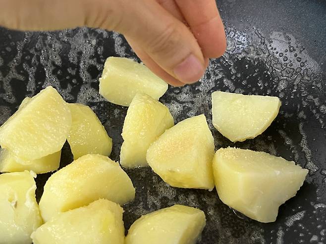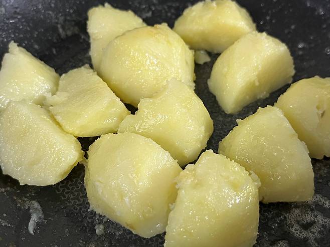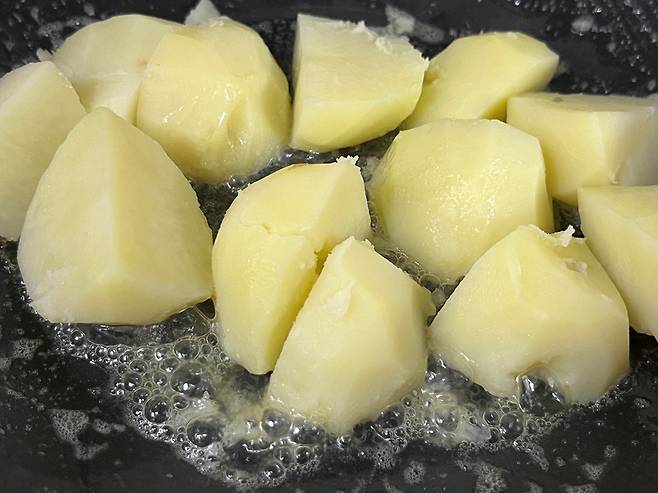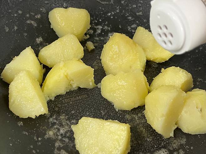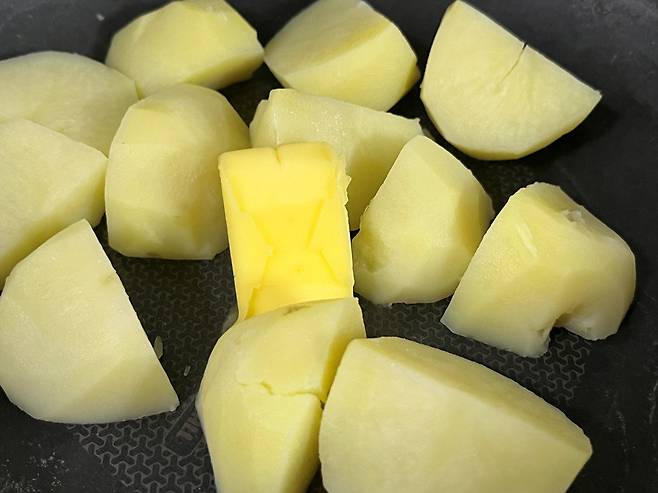 버터는 풍미와 고소함을 내기 위해서 넣었는데, 양이 많으면 오히려 느끼한 맛이 나기 때문에 적당량만 넣으세요. 버터가 고르게 코팅되도록 감자를 섞어 줍니다.