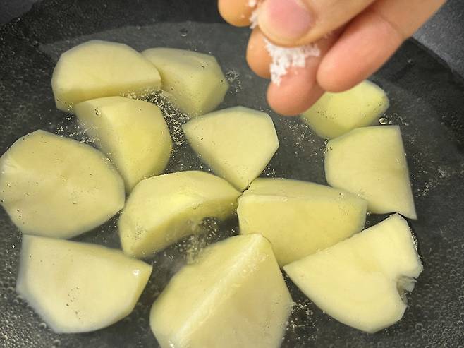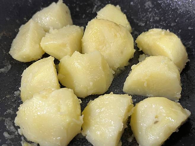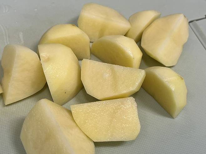 저는 알이 작은 감자 3개를 가지고 만들었습니다. 감자는 세척하여 껍질을 벗기고, 한 입에 먹기 편한 사이즈로 조각내세요.