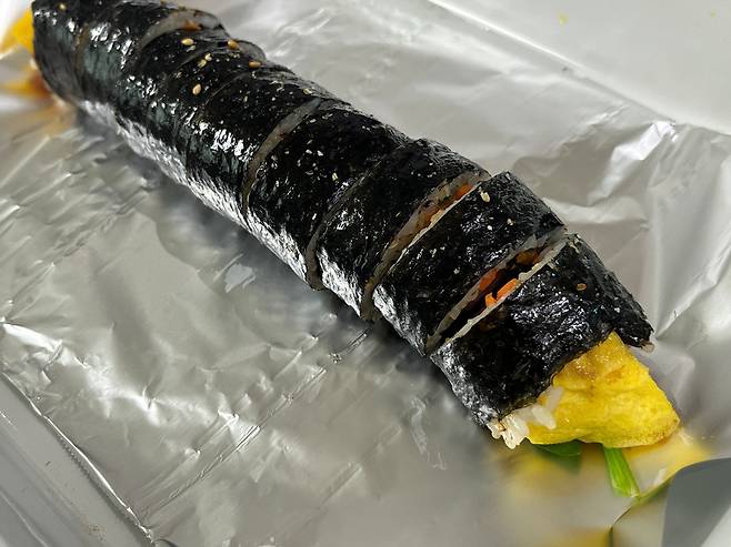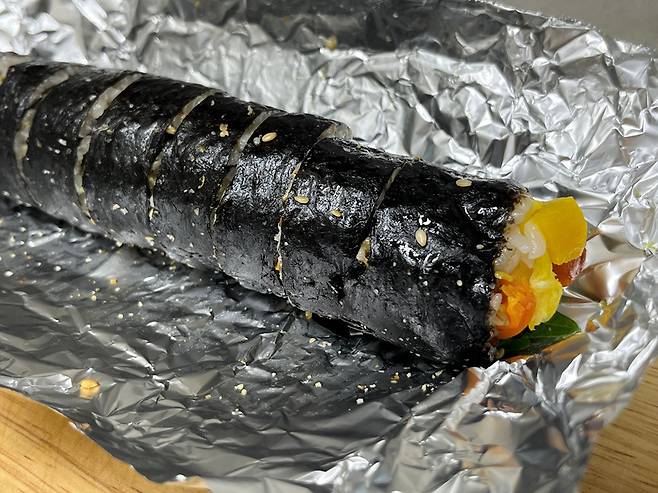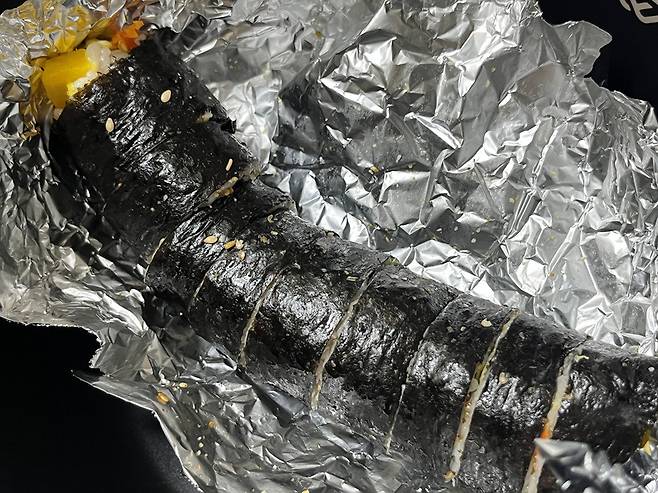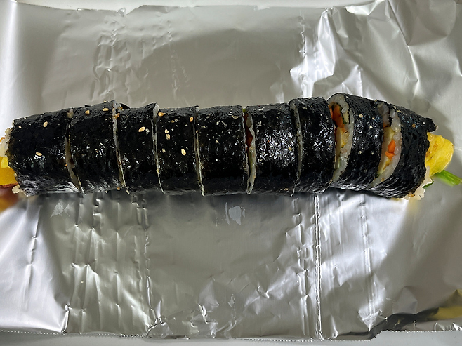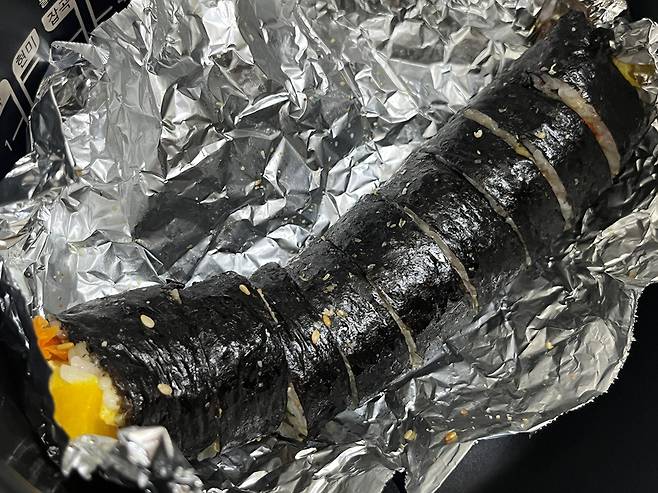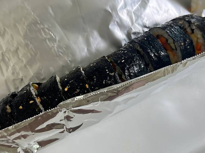 이때 호일을 활용해 보세요. 김밥집에서 이런 호일에 김밥을 싸서 주는 것을 많이 보셨을 겁니다. 김밥은 만들어서 먹기 좋게 자른 뒤, 먹을 양만 남기고 나머지는 이렇게 호일에 감싸세요.