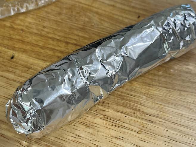 호일을 넉넉하게 뜯어서 김밥을 꼼꼼하게 감싸 줍니다. 호일은 공기 차단력이 뛰어나 밥알의 수분이 빠져나가는 것을 최소화합니다. 또한 그냥 랩보다 두껍고 밀폐력이 높아, 김밥의 단면이 건조해지는 것을 막아줍니다.