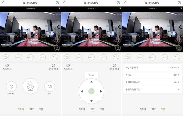 스마트 카메라에 연결하면 기본 카메라 메뉴에 이어 하단에 인터콤, PTZ, 조명의 3가지 항목을 볼 수 있다. 인터콤은 C300에 내장된 스피커와 마이크를 이용해 스마트폰으로 양방향 음성 대화를 할 수 있으며, 화면을 캡쳐하고 녹화된 영상도 확인 가능하다.