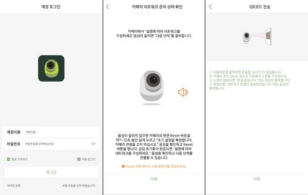 이후에는 카메라 암호 및 카메라 이름을 설정하고 microSD 카드가 삽입된 상태면 카메라 기록 저장방식도 상시 녹화를 할 것인지 이벤트 녹화(알림 발생시)를 할 것인지 사용자가 정해줄 수 있다. 이벤트가 발생할 때 스마트폰으로 바로 알림을 보낼 것인지도 선택 가능하다.