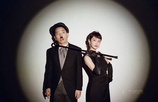 올블랙 의상으로 오드리 헵번과 찰리 채플린을 완벽 오마주한 첫 번째 컷! 김지민 언니는 헵번 스타일의 블랙 드레스와 장갑으로 우아함을 뽐내고, 김준호 오빠는 중절모와 지팡이로 채플린의 익살스러움을 완벽 재현했어요! 빈티지 조명 아래 두 사람의 장난기 넘치는 표정은 덤! 둘의 찰떡 케미 덕분에 보는 내내 엄마 미소가 지어졌다는 건 안 비밀…(✿◡‿◡)