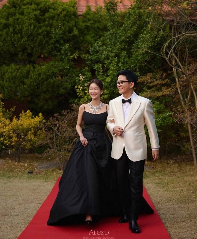 싱그러운 정원을 배경으로 한 두 번째 컷은 클래식 웨딩룩의 정석을 보여줬어요! 김지민 언니는 화이트 시스루 드레스에 화이트 리본으로 청순함을 더하고, 김준호 오빠는 브라운 체크 수트에 옐로 틴트 안경으로 포인트를 줬네요! 잔잔한 햇살 아래 웃음꽃이 활짝 핀 두 사람…♥ 이 사진 보니까 저까지 덩달아 행복해지는 기분이었어요!